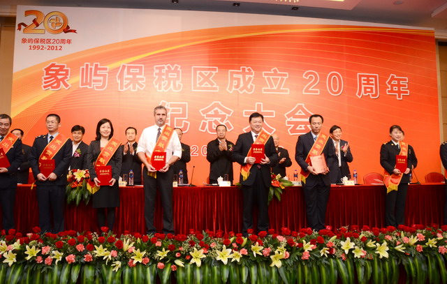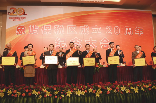 11月28日上午,在慶祝廈門象嶼保稅區(qū)成立20周年的喜慶日子里,廈門市委、市政府隆重舉行慶祝大會(huì),回顧保稅區(qū)20年的奮斗歷程,總結(jié)保稅區(qū)20年的發(fā)展經(jīng)驗(yàn),展望保稅區(qū)更加美好的發(fā)展未來。為保稅區(qū)建設(shè)立下汗馬功勞的10家突出貢獻(xiàn)企業(yè)和10位突出貢獻(xiàn)個(gè)人受到了隆重表彰。其中,廈門象嶼集團(tuán)有限公司、廈門象嶼股份有限公司榮獲突出貢獻(xiàn)企業(yè),象嶼集團(tuán)黨委書記、董事長王龍雛,象嶼建設(shè)集團(tuán)常務(wù)副總經(jīng)理王澍陶榮獲突出貢獻(xiàn)個(gè)人。