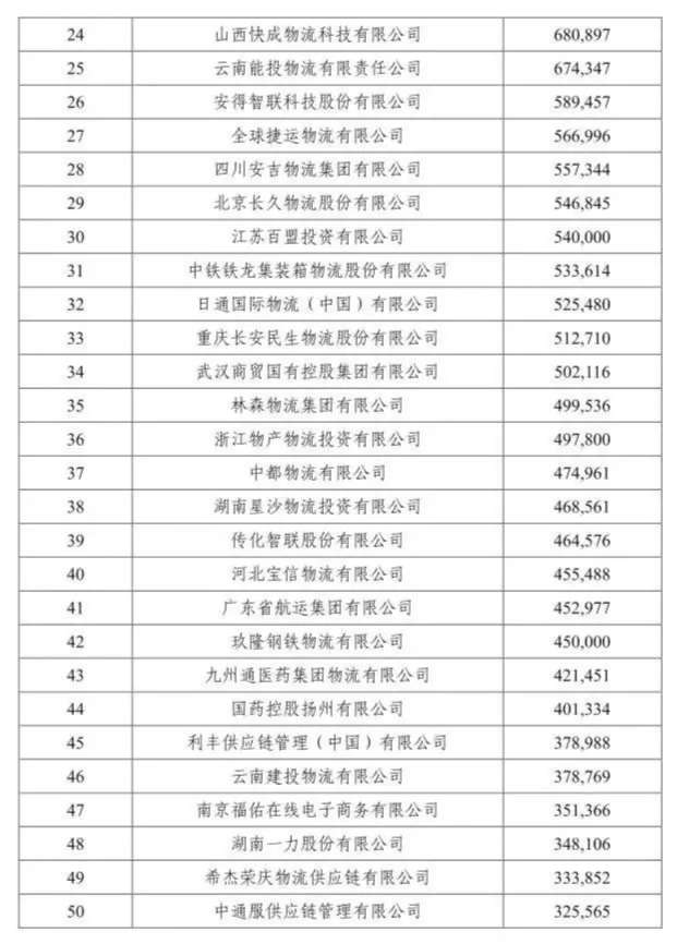 該榜單由中國物流與采購聯(lián)合會組織評選,按照重點(diǎn)物流企業(yè)統(tǒng)計調(diào)查結(jié)果提出了2019年度中國物流企業(yè)50強(qiáng)排名。據(jù)悉, 50強(qiáng)物流企業(yè)2018年物流業(yè)務(wù)收入合計9833億元,按可比口徑計算,同比增長16.9%。50強(qiáng)物流企業(yè)門檻提高到32.6億元,比上年增加3億元。