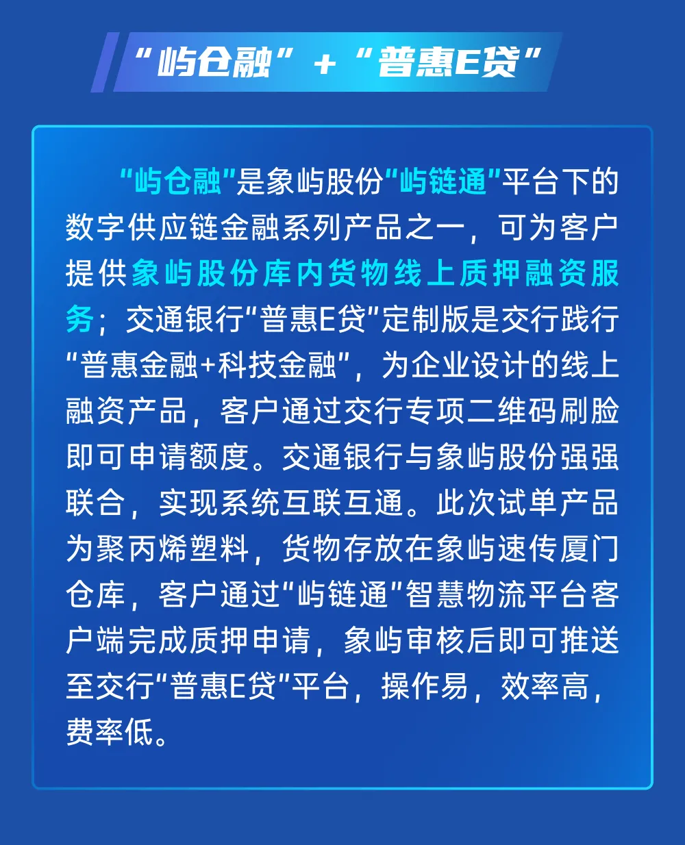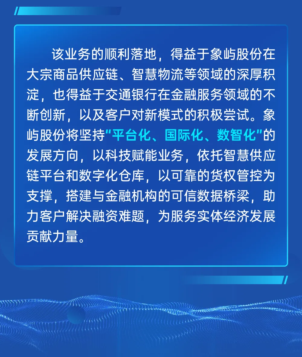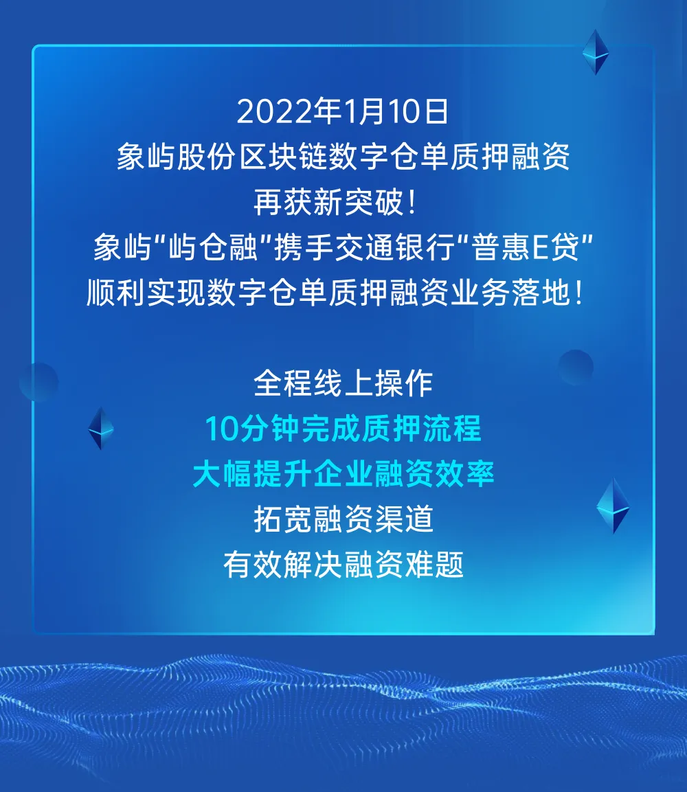 象嶼“嶼倉(cāng)融”助力交行“普惠E貸”數(shù)字倉(cāng)單質(zhì)押融資業(yè)務(wù)成功落地!